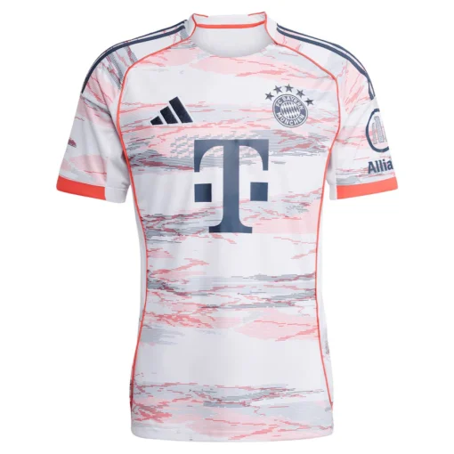 The adidas Bayern Munich Away Jersey 25/26 showcases a clean white base accented with subtle grey and coral details. It includes short sleeves and a comfortable crewneck collar for a classic fit. The FC Bayern crest sits prominently over the heart, framed by five gold stars that honor the club’s impressive 34 Bundesliga championships.