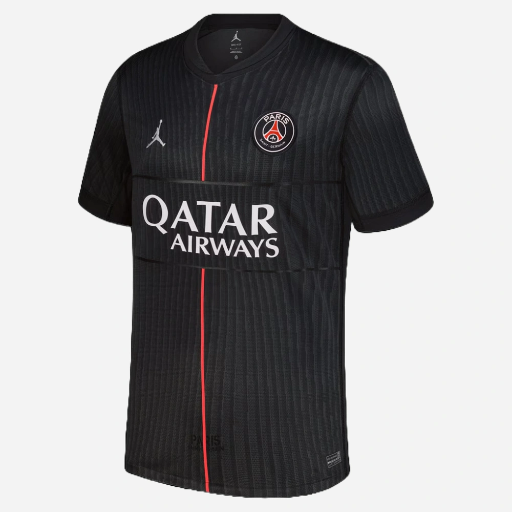 The Jordan PSG Fourth Jersey 25/26 features a sleek black base with subtle grey accents and soft pink details. A bold red central stripe completes its striking design, making it a statement piece for your streetwear collection.