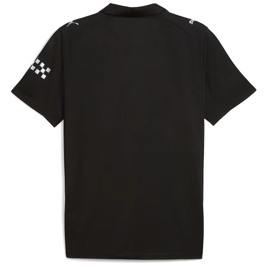 The Manchester City Away Jersey 25/26 features a rich black base with metallic details for a bold, delivering a sleek and standout design. A classic polo collar with a crisp white trim adds a touch of tradition.