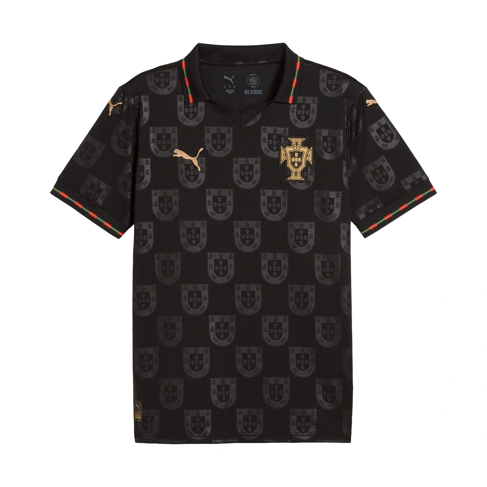 The Portugal Black Panther Jersey 2026 features a bold black base with sleek gold details, creating a modern look that celebrates Portugal’s football legacy. It also showcases a full-jersey pattern of Portugal’s historic shield crest.