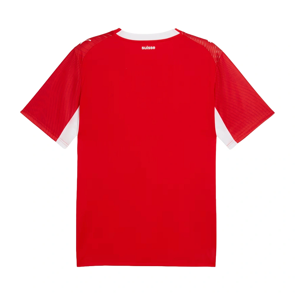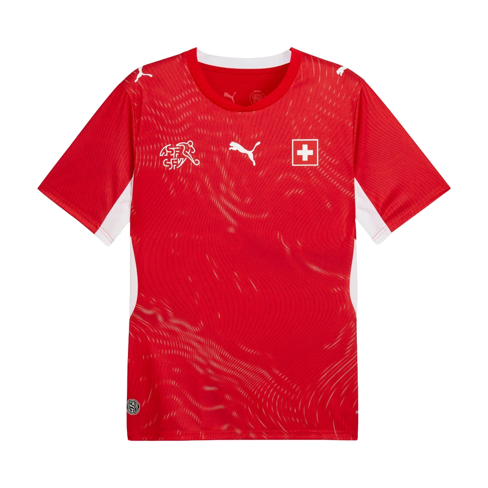 The Switzerland 2026 World Cup Home Jersey also includes crisp white accents. These sharp details highlight the modern crewneck collar, as well as the sides of the torso and sleeves. The layout offers a perfectly balanced look across the chest. The Swiss flag badge sits proudly over the heart, the SFV crest rests on the right side, and the PUMA logo anchors the very center. Finished with short sleeves and a comfortable everyday feel, this design looks as sharp in the stands as it does on the field.
